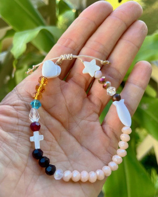 La estrella de Oriente (🌟) que guió a tres grandes Reyes (tres cuentas) hasta el nacimiento del Rey (cuenta transparente). Cuando creció fue carpintero (cuenta marrón) y pescador de hombre (pez). Tuvo 12 discípulos (12 cuentas) para predicar la verdad (cuenta blanca). Un día de envidia, odio y maldad (3 cuentas negras) lo crucificaron (cruz). Derramó su sangre (cuenta roja) para purificarnos (cuenta transparente) y subió al cielo (cuenta azul) en nombre del Padre, Hijo y Espíritu Santo (cuentas doradas). Todo lo hizo por amor (❤️)!